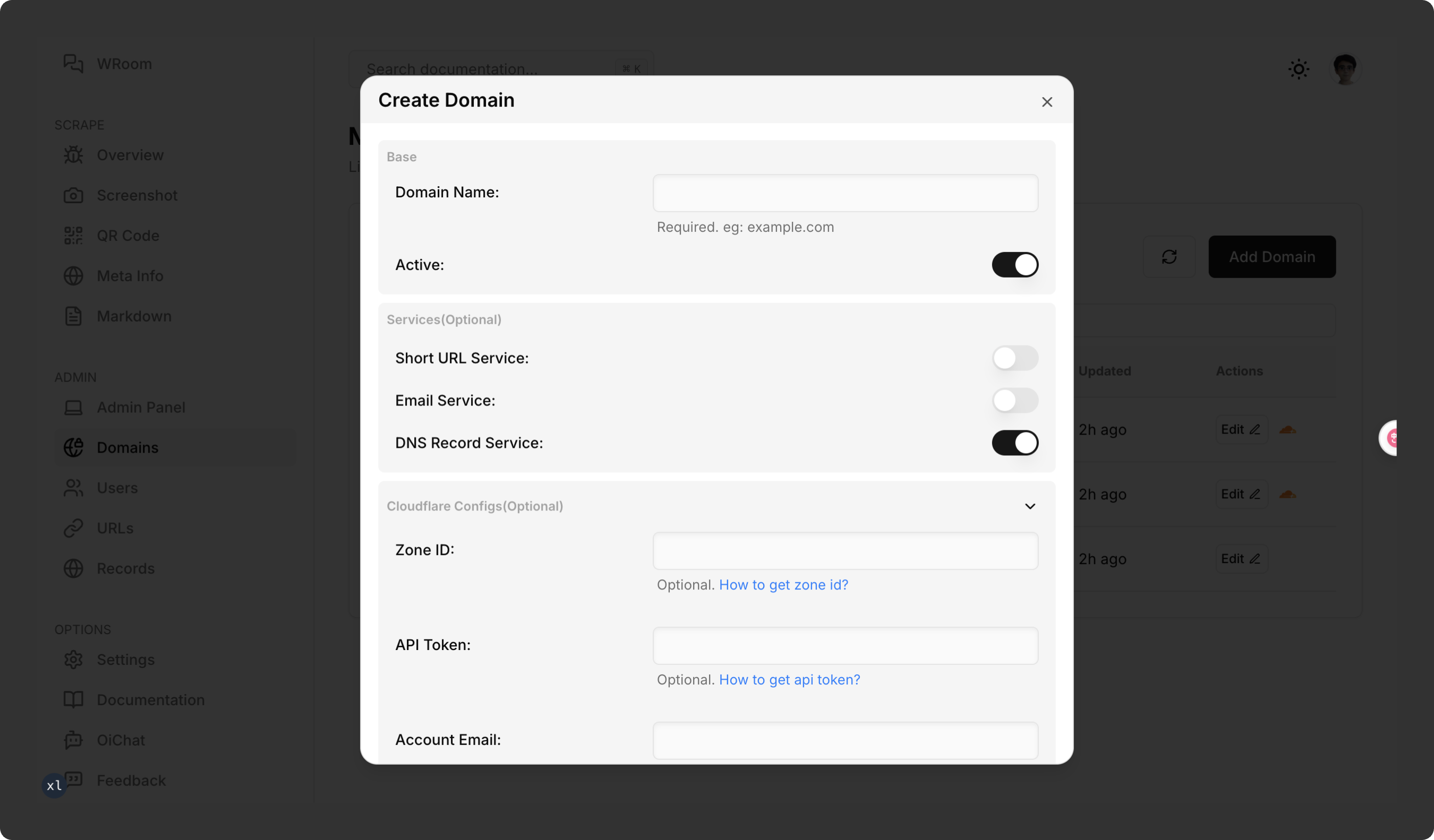 To enable the DNS Record Service, you must complete the Cloudflare Configs(Optional) form with the following fields: